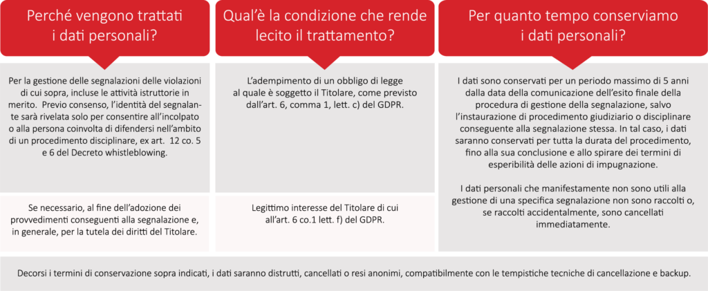 I dati comuni del segnalante, nonché tutte le informazioni riconducibili a persone fisiche fornite dal segnalante in ordine a specifici comportamenti, atti od omissioni ritenuti potenzialmente illeciti, ai sensi del Decreto whistleblowing, nonché lesivi dell’interesse pubblico o dell’integrità del Titolare. – Fonte dei dati: i dati del segnalante, quelli del segnalato e/o di terzi sono forniti direttamente dal segnalante stesso e/o da terzi nel corso delle attività istruttorie.
